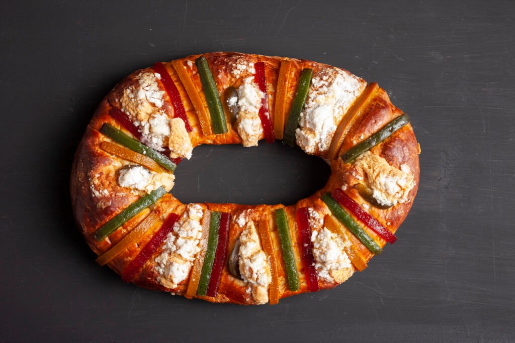 The roscón is more typical in January, on Three Kings’ Day, but you can already find it in many bakeries and pastry shops throughout December. The Roscón de Reyes is a traditional Spanish cake enjoyed on January 6th, the Día de Reyes (Three Kings’ Day). It’s a large, ring-shaped sweet bread, often decorated with fruits, sugar, and sometimes sliced almonds, symbolizing the jewels of a crown. Inside, there are usually two hidden surprises: a small figurine (representing a king or a saint) and a dry bean. Tradition says that whoever finds the figurine is “king or queen” for the day, while the person who gets the bean has to buy the roscón next year!